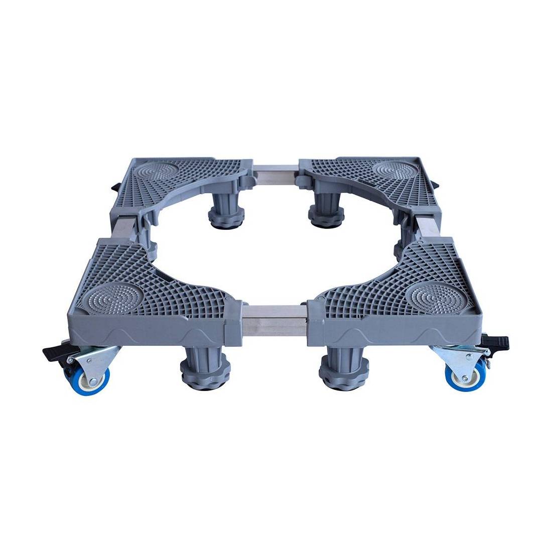 Base e rivestimento in robusta plastica antiurto antiscivolo, staffe telescopiche in acciaio. Base ad ampiezza regolabile. Completo di 8 robusti piedini di sollevamento e 4 doppie ruote piroettanti bloccabili con freno da Ø 50 mm in polipropilene. Utilizzato principalmente per spostare o alloggiare lavatrici, frigoriferi, asciugatrici, cantinette, armadi, condizionatori d'aria, utensili, grandi vasi per piante. Portata max 150 kg.