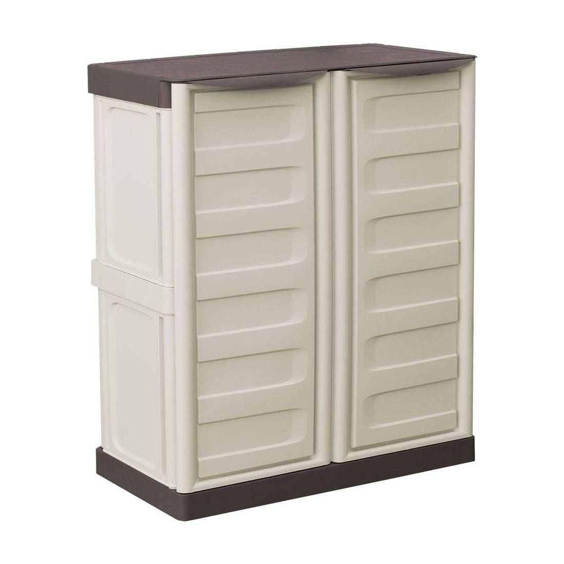 In plastica. 1 ripiano, 2 ante. Dotato di cerniera in acciaio antiusura ed i ripiani sono parte integrante della struttura, dando maggior stabilità e portata all'armadio. Capacità di carico per ripiano di 25kg.