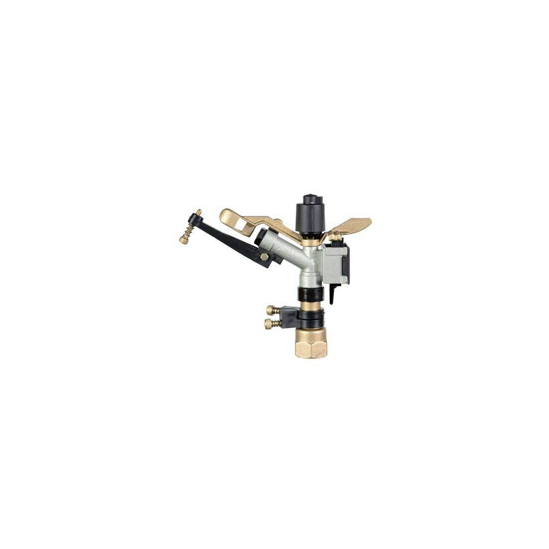 En laiton, alliage léger et rilsan. 1 jet. Pour l'irrigation par aspersion lente des vignobles, vergers et potagers. Avec buses interchangeables et diffuseur réglable. Raccord avec filetage femelle. Pression : de 1,5 à 4 bars. Portée : de 12 à 17 mètres. Débit : de 20 à 60 litres/minute. Surface irriguée : de 452 à 907 mètres carrés. Inclinaison à 30°.