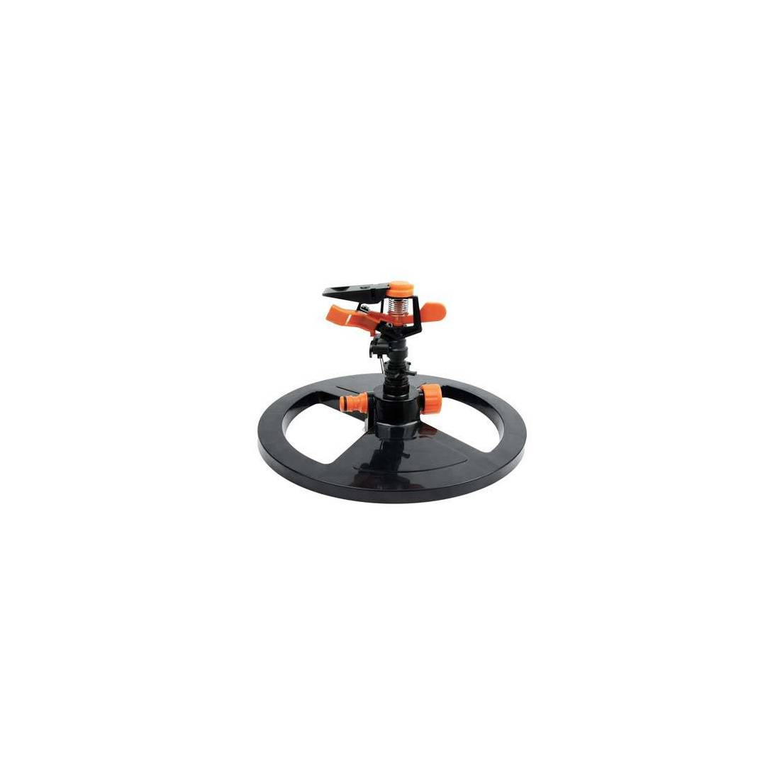 En plastique. Jet à secteurs variables de 15° à 360°. Sur socle avec raccord rapide et raccord fileté mâle traversant. Diamètre d'arrosage jusqu'à 17 m. Pression de service : de 2 à 4 bars.