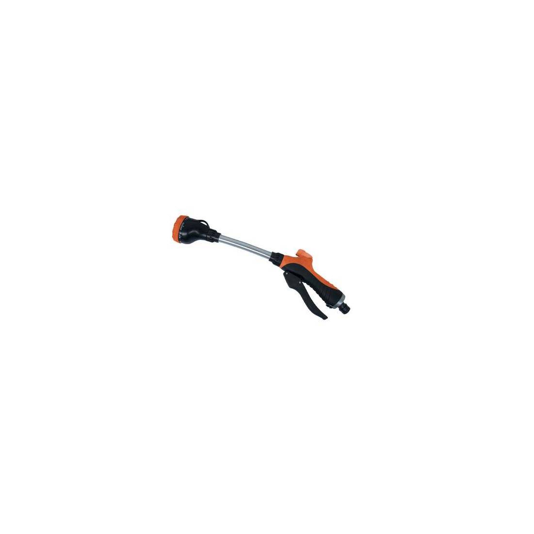 Avec huit fonctions d'arrosage. Raccord rapide et tige en aluminium. Poignée avec levier et réglage du débit. Longueur totale : 38 cm.