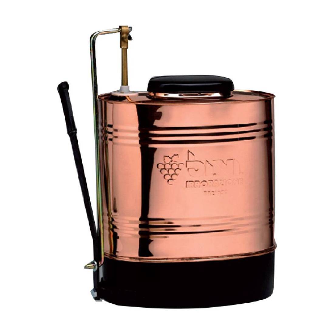 Serbatoio in rame e base in metallo verniciato. Stantuffo in materiale anticorrosivo. Ghiera di regolazione, setaccio e coperchio ovali. Indicata per pesticidi, erbicidi, antiparassitari. Valvola in acciaio inox 11 mm. Pressione di lavoro costante 3,5 BAR, pressione massima 7 BAR. Completa di tubo in gomma da 1,2 metri, cinghie regolabili. Leva sinistra.