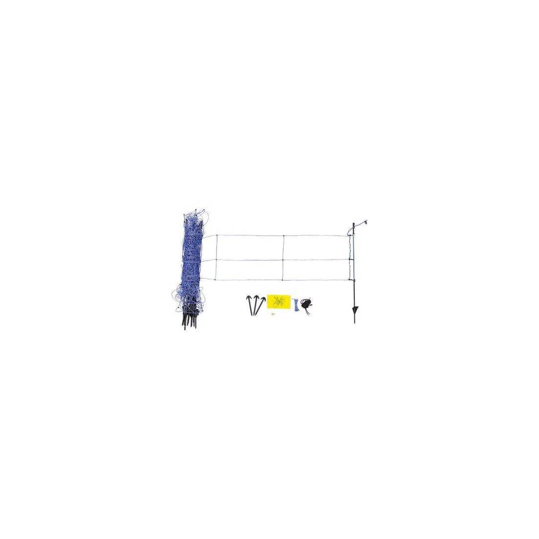 Filet électrifiable pour sangliers. Hauteur 90 cm (3 fils horizontaux), 12 piquets en fibre de verre bleue avec une distance entre les piquets d'environ 4,5 m. Fourni avec : douilles de raccordement, 3 ancrages avec corde en nylon noir pour la traction, fil de réparation et panneau de signalisation.
