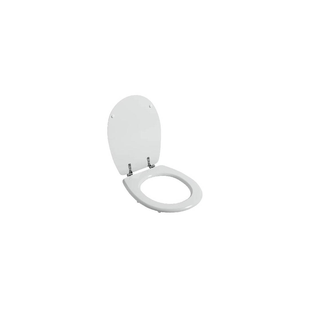 Siège (forme type 6 - charnières type A) dédié à la série Ausil Line de Casa Ceramica Sanitosco. Dimensions : largeur 37,7 cm ; longueur 46-48 cm ; entraxe 16 cm. Siège en bois travaillé, moulé en polyester. Charnières réglables et vis de fixation en laiton chromé. (DianFlex) Dimensions : blanc