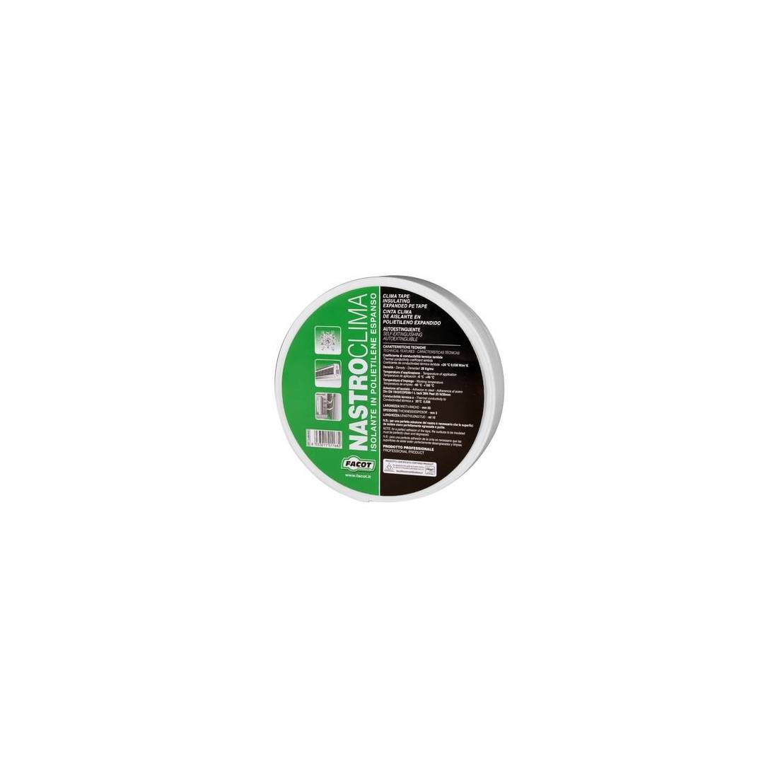 Ruban en polyéthylène expansé réticulé pour l'isolation thermique des installations de climatisation. Mode d'emploi : La surface doit être dégraissée et sèche. Enrouler le ruban en spirale sur les tuyaux en le chevauchant de 20 % à 50 % selon l'épaisseur nécessaire. Retirer le film protecteur au fur et à mesure de l'application du ruban isolant.(DianFlex) Dimensions : H 50 mm x 10 m