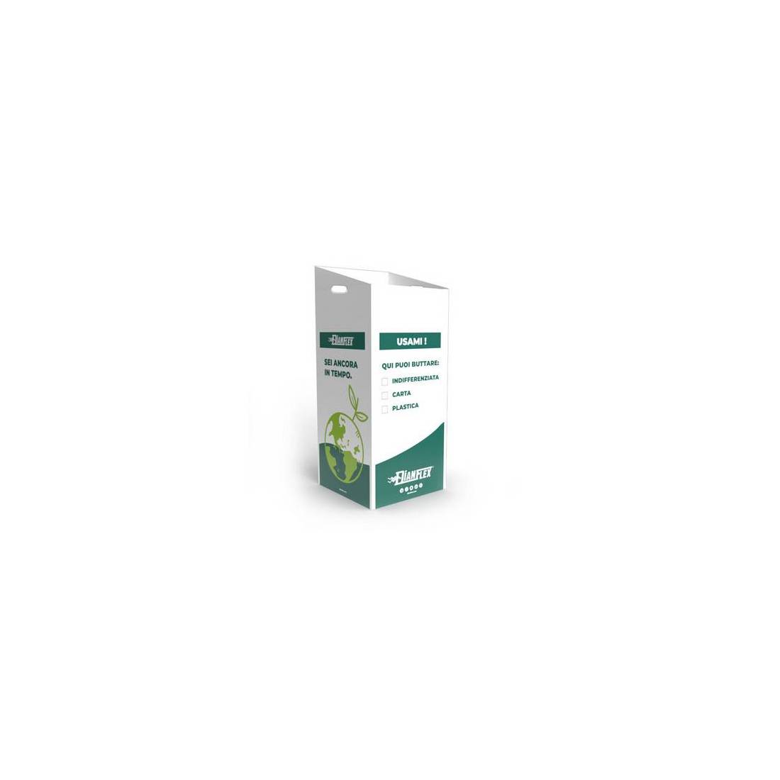 Conteneur en carton pour le tri sélectif des déchets. Automontable, avec deux poignées pratiques pour faciliter son transport et son vidage. Possibilité d'indiquer le type de déchets, au choix parmi : non triés, papier et plastique. Avec un graphisme inspiré de la protection de l'environnement et un appel à l'action pour encourager l'utilisation du produit. Parfait pour les événements, les fêtes et les bureaux. (DianFlex) Dimensions : 38 x 38 x H. 80 cm