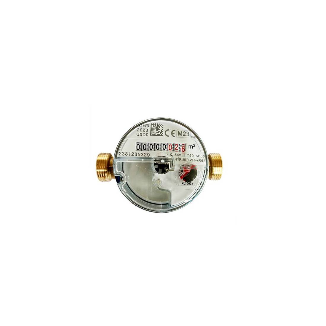 Eau froide T 50 °C. SJ EVO est prédisposé pour la communication à distance : il peut être équipé, même après la première installation, d'un module de transmission radio 868 MHz Wireless M-Bus (en option) ou d'un module de transmission M-Bus filaire (en option), tout en conservant ses caractéristiques mécaniques, métrologiques et de lisibilité. Il s'agit de la nouvelle gamme de compteurs d'eau à jet unique à cadran sec à transmission magnétique Super Dry 8 rouleaux. Conçue pour répondre aux exigences strictes de la directive 2014/32/UE (MID) et de la norme européenne UNI EN ISO 4064. Équipée de modules de vérification de conformité : B+D obtenant un rapport maximal Q3/Q1(R) égal à 160 pour les installations horizontales et 63 pour les installations verticales. Il est certifié pour une utilisation avec de l'eau potable conformément au décret ministériel n° 174 du 6/4/2004. Boîtier en laiton (OT58) moulé (DianFlex). Taille : 1/2".