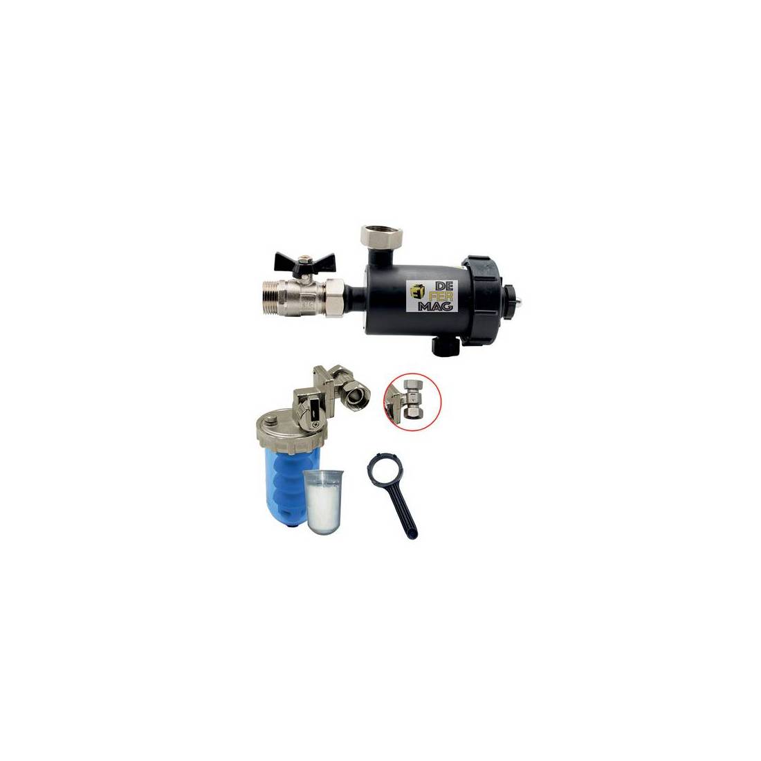 Kit de protection de la chaudière composé de : Dosafer SG avec dérivation et bague rotative horizontale et verticale, avec 1 cartouche de 80 g, usage alimentaire. Défloculateur magnétique Defermag 12800 Gauss pour éliminer les saletés et les débris. (DianFlex)