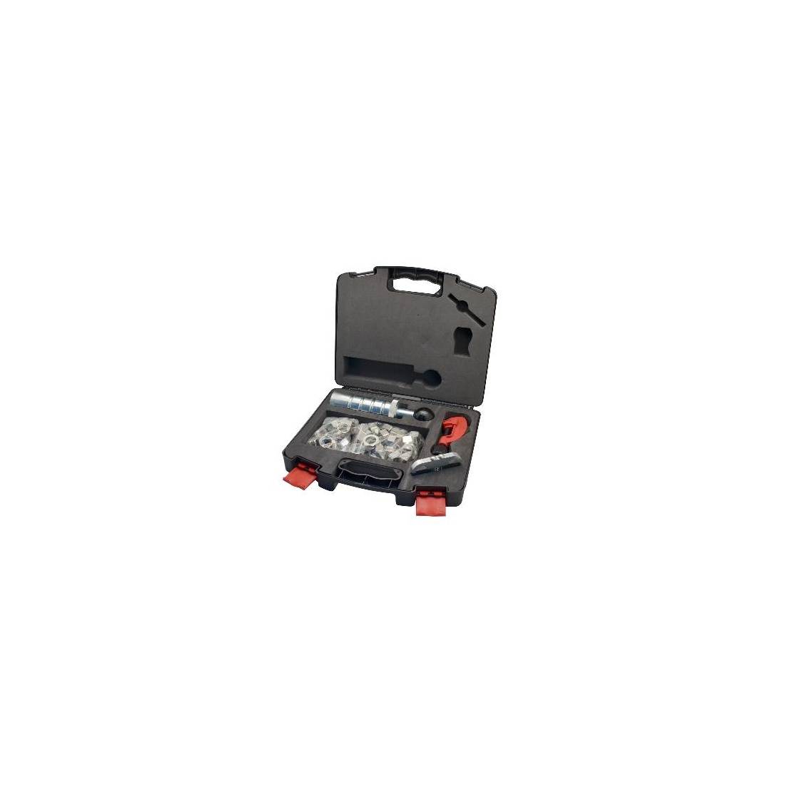 Le kit comprend : mallette - relieuse - coupe-tube max. diam. 28 mm - gabarit pour tube 1/2" et 3/4" - 20 écrous diam. 1/2" avec joint - 20 écrous diam. 3/4 avec joint. (DianFlex)