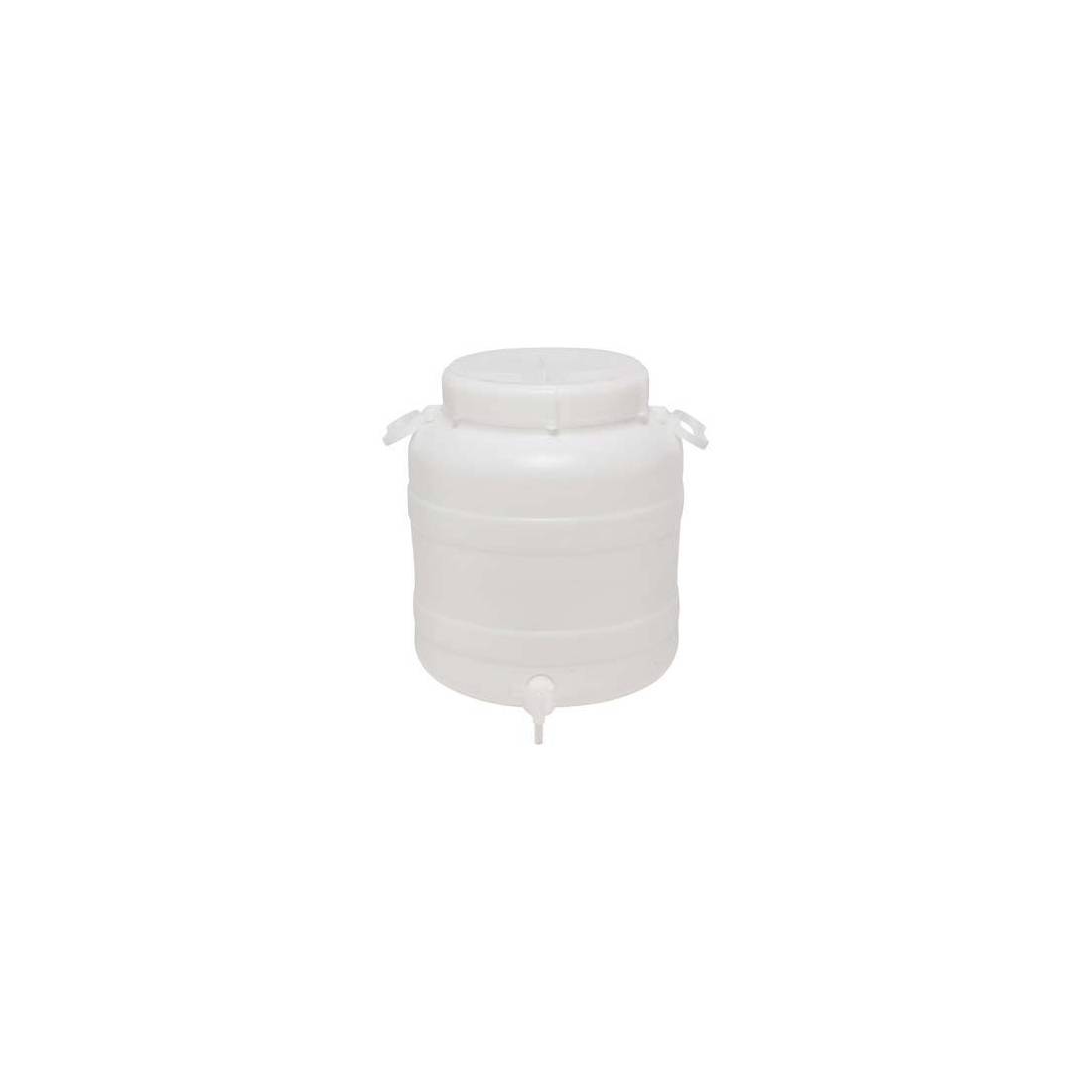 En polyéthylène alimentaire, avec filetage femelle pour le robinet. Avec bouchon à vis et poignées.