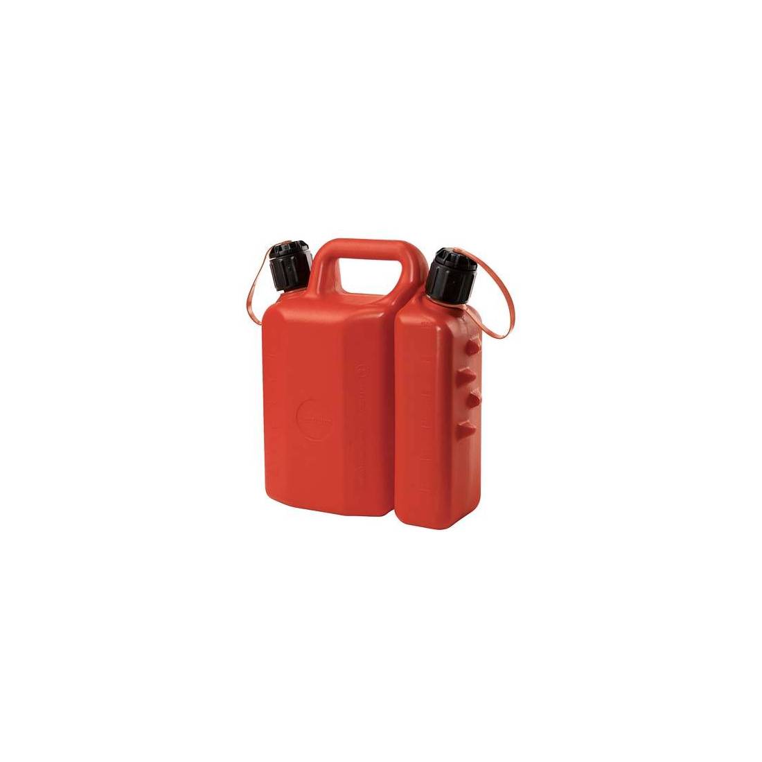 En plastique. Avec double réservoir. Homologuée pour les carburants.