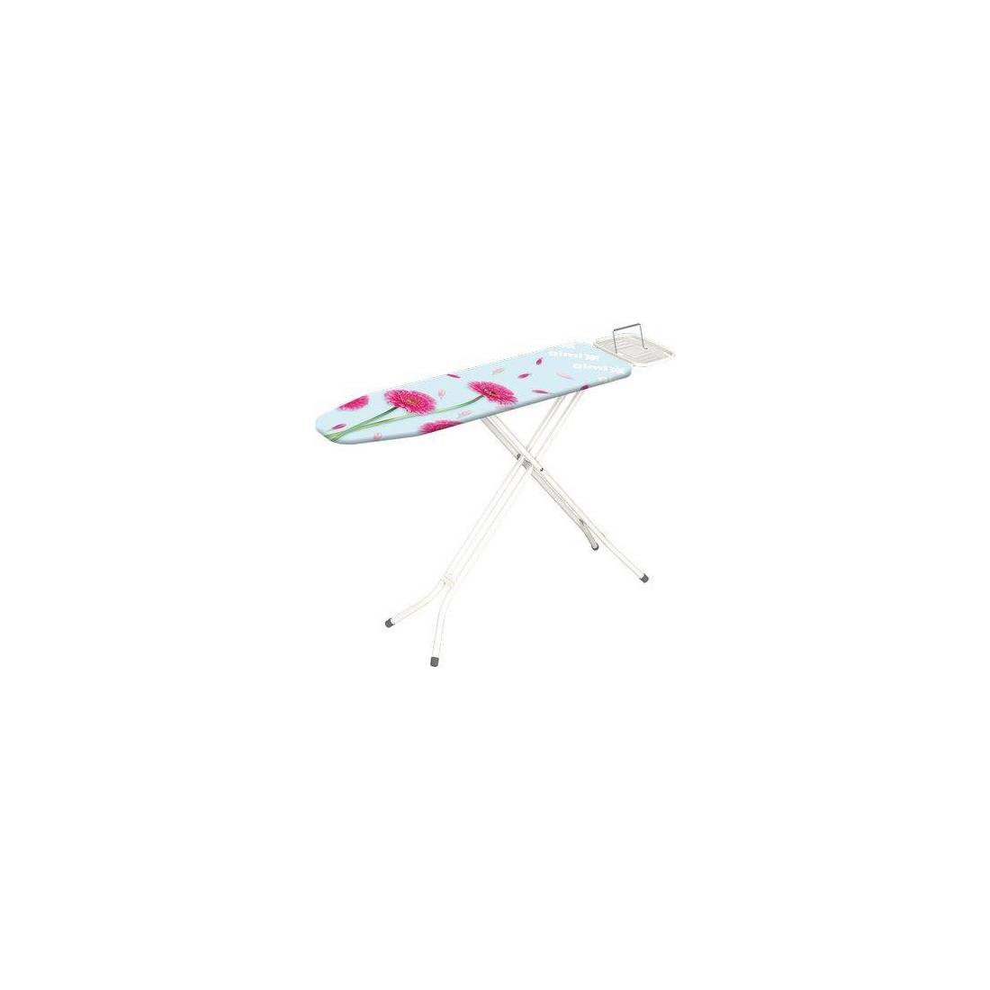 En acier. Équipée d'un repose-fer avec arceau réversible, également adapté aux gauchers. Structure des pieds à section ronde. Housse 100 % coton avec rembourrage en molleton. Plan de repassage 110 x 33 cm.