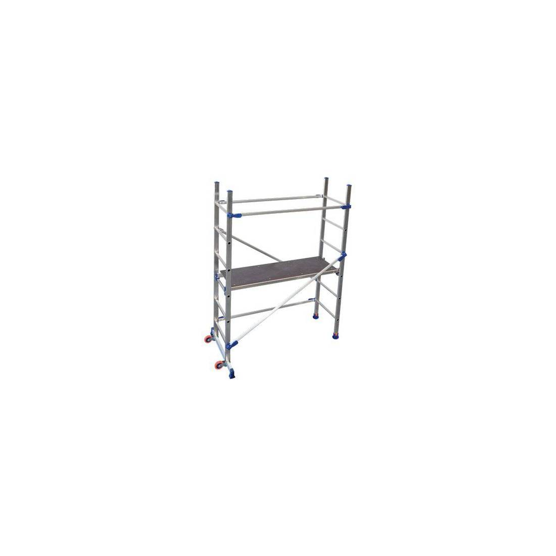 Structure en aluminium, montage rapide sans vis ni outils, particulièrement solide et compacte grâce aux leviers à ailettes à expansion. Plan de travail 41 x 125 cm, barre stabilisatrice avec roues inactives. Position boiteuse pour les escaliers et les faux planchers. Les diagonales s'accrochent également d'un seul côté, laissant le côté de travail libre. Largeur du montant 89 cm, hauteur 1,89 m. Charge maximale : 150 kg. Poids : 14,00 kg. Conforme au décret législatif 81/2008.