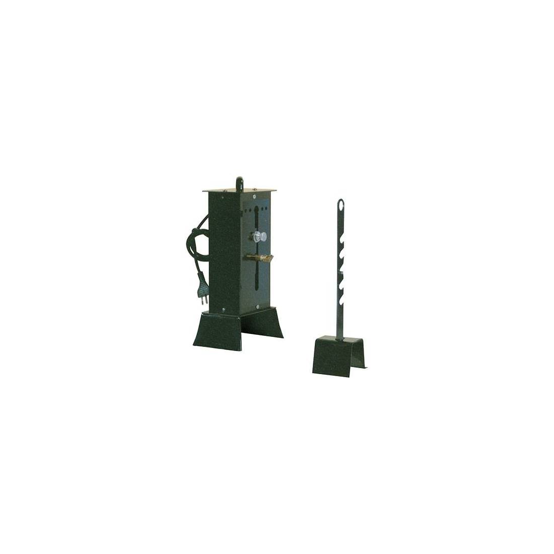 En tôle d'acier robuste. Peut supporter 1 broche pouvant peser jusqu'à 5 kg de viande, à une vitesse de 2 tours par minute. La hauteur de la broche par rapport au sol est réglable de 11 à 24 cm. Fourni avec une colonne pour poser la broche. Tension 220 V.