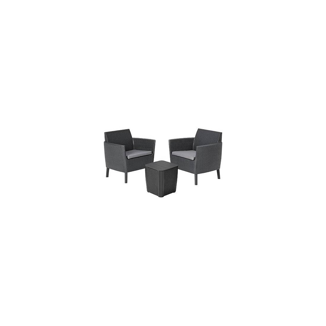 En polypropylène effet rotin. Coussins inclus. Composé de : 2 fauteuils de 74 x 66,5 x 76 cm et 1 table basse avec rangement de 39 x 39 x 42 cm.