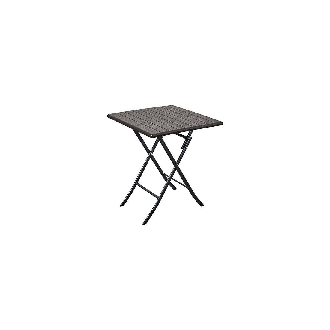 Structure et supports en acier peint. Surface en HDPE imitation bois de couleur marron. Repliable en valise avec poignée pratique pour le transport.