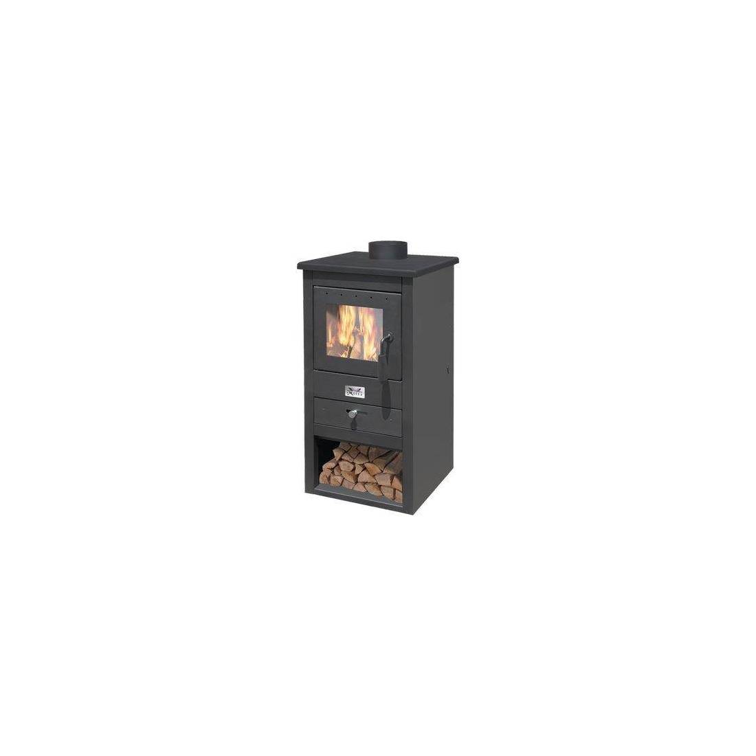 En acier peint de 2 mm, plateau supérieur surdimensionné avec raccord pour tuyau d'évacuation des fumées. Chambre de combustion à 6 briques réfractaires avec porte à ventilation anti-buée, double charnière latérale et vitre céramique spéciale pour des températures élevées jusqu'à 800 °C. Poignée articulée indépendante et poignée en caoutchouc silicone résistant jusqu'à 600 °C. Grand tiroir entièrement amovible pour faciliter le ramassage des cendres résiduelles et dispositif à glissière horizontale pour une bonne carburation de la combustion. Dimensions : 430 x 410 x 860 mm. Diamètre de la sortie des fumées supérieure : 130 mm. Poids : 50 kg. (tuyau d'évacuation recommandé : Plus Light)