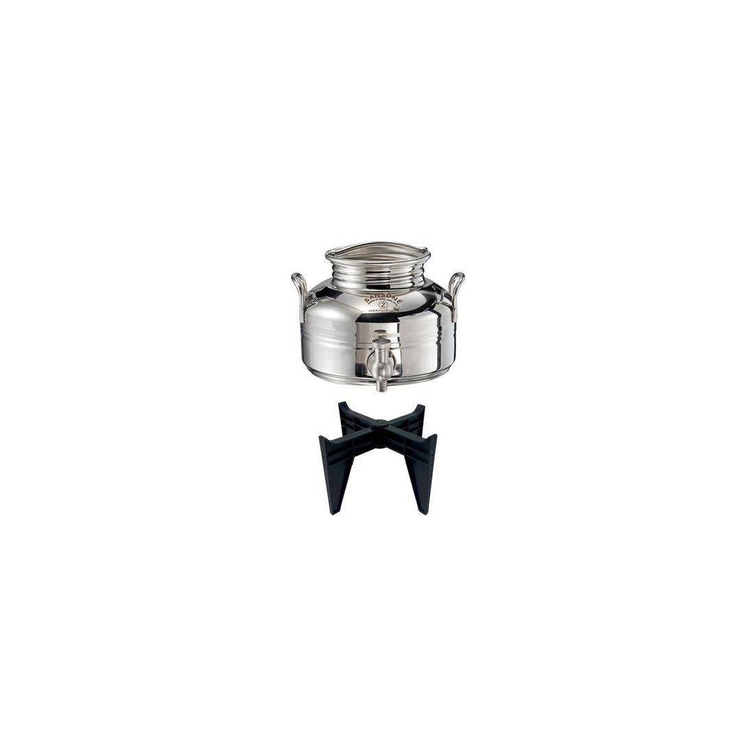 En acier Aisi 304 BA. Soudé selon la technique « bout à bout » qui facilite le nettoyage et évite le dépôt de matières organiques et de résidus. Équipé d'un robinet avec joint de protection amovible. Bouchon ½ pouce, poignée et support en PVC inclus.