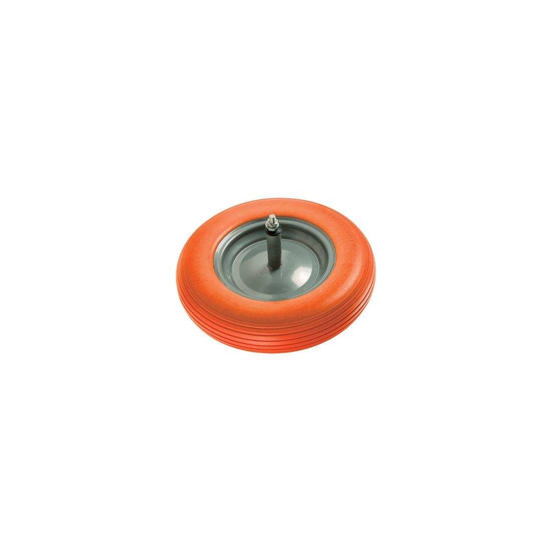 En polyuréthane anti-crevaison 3,5x8". Disque en métal peint et axe 12x260 mm. Moyeu 200 mm. Avec douille en nylon.
