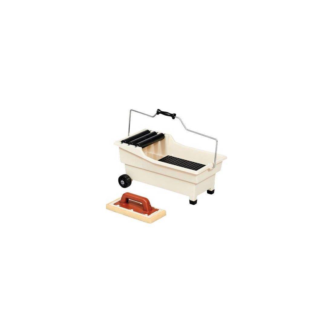 Bac en plastique antichoc avec deux roues et deux pieds pour faciliter le déplacement. Trois rouleaux en plastique sur des axes en acier. L'éponge à très haute absorption garantit un nettoyage parfait. Une taloche éponge avec poignée est également fournie.