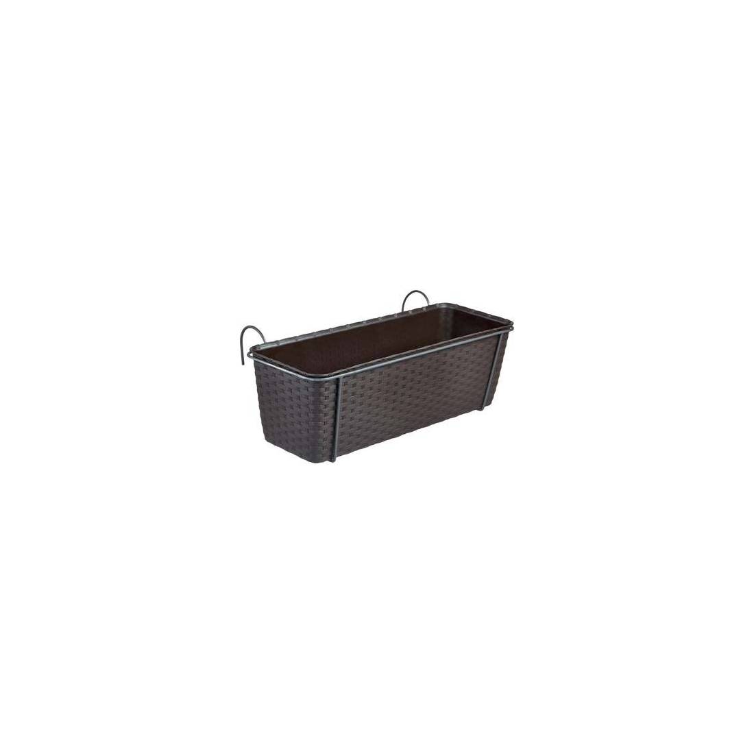 En polypropylène avec réserve d'eau. Style rotin. Complet avec support métallique pour balcon de couleur anthracite. Capacité 9,2 litres.