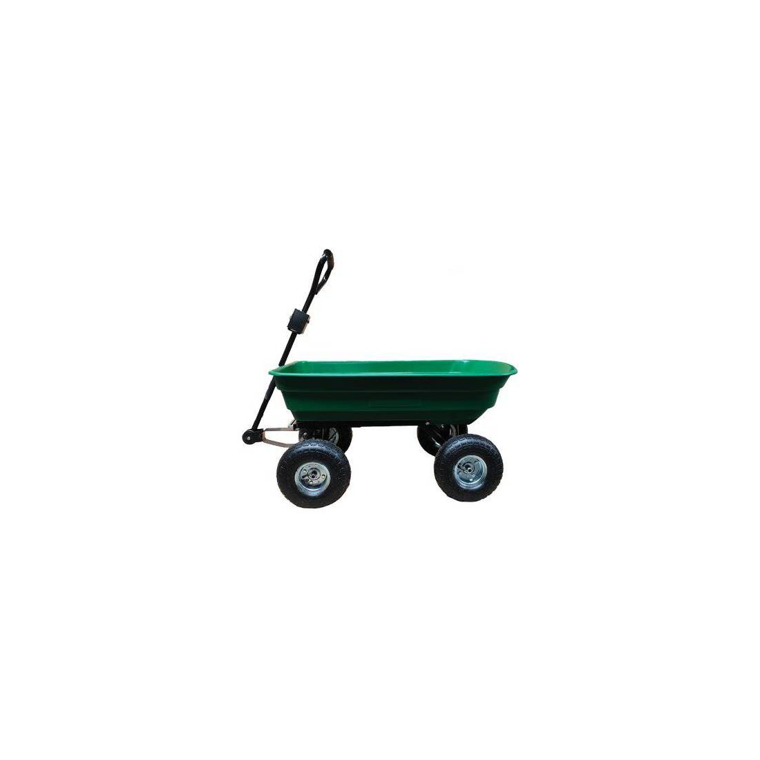 Structure en acier peint. Cuve en polypropylène rabattable avec déverrouillage manuel. 4 roues pneumatiques et jantes en métal. Capacité de charge 200 kg. Dimensions : 107 x 51 x 94 cm.