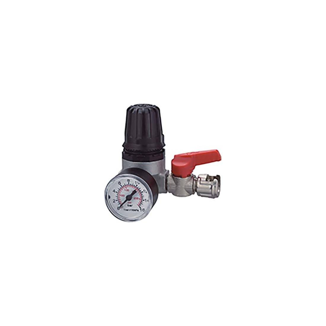Avec manomètre rond de 40 mm de diamètre, échelle 0-16 bar, 0-230 psi. Corps en aluminium sablé. Système de régulation de la pression à piston. Bouton de réglage équipé d'un système de blocage en technopolymère. Soupape de décharge pour surpressions, fonction de décompression de série. Robinet de ligne.
