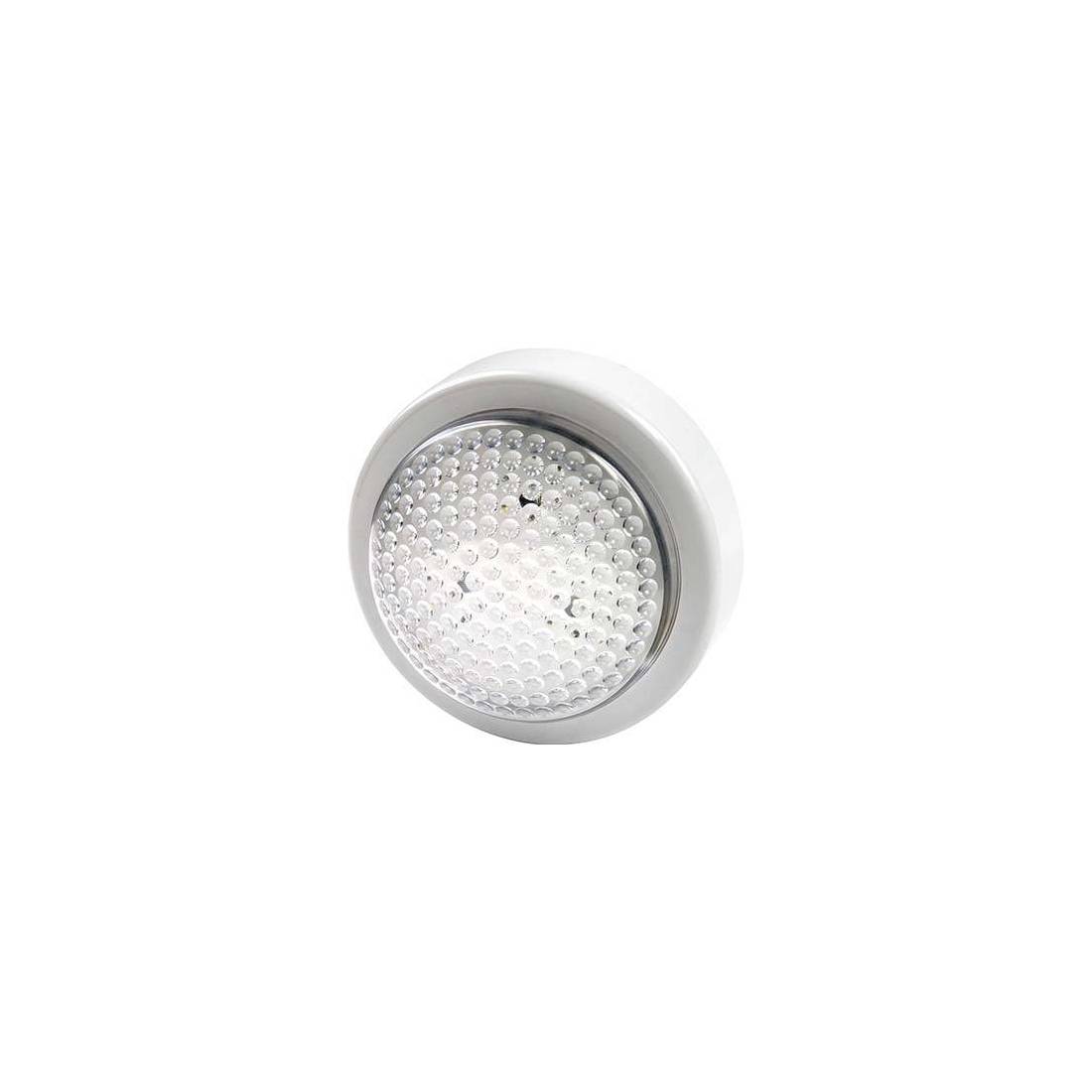 Coque en ABS. 3 LED. Lumens 10. Lumière diffuse. Diamètre 100 mm, épaisseur 50 mm. Couleur blanche. Alimentation par 2 piles AA non fournies.