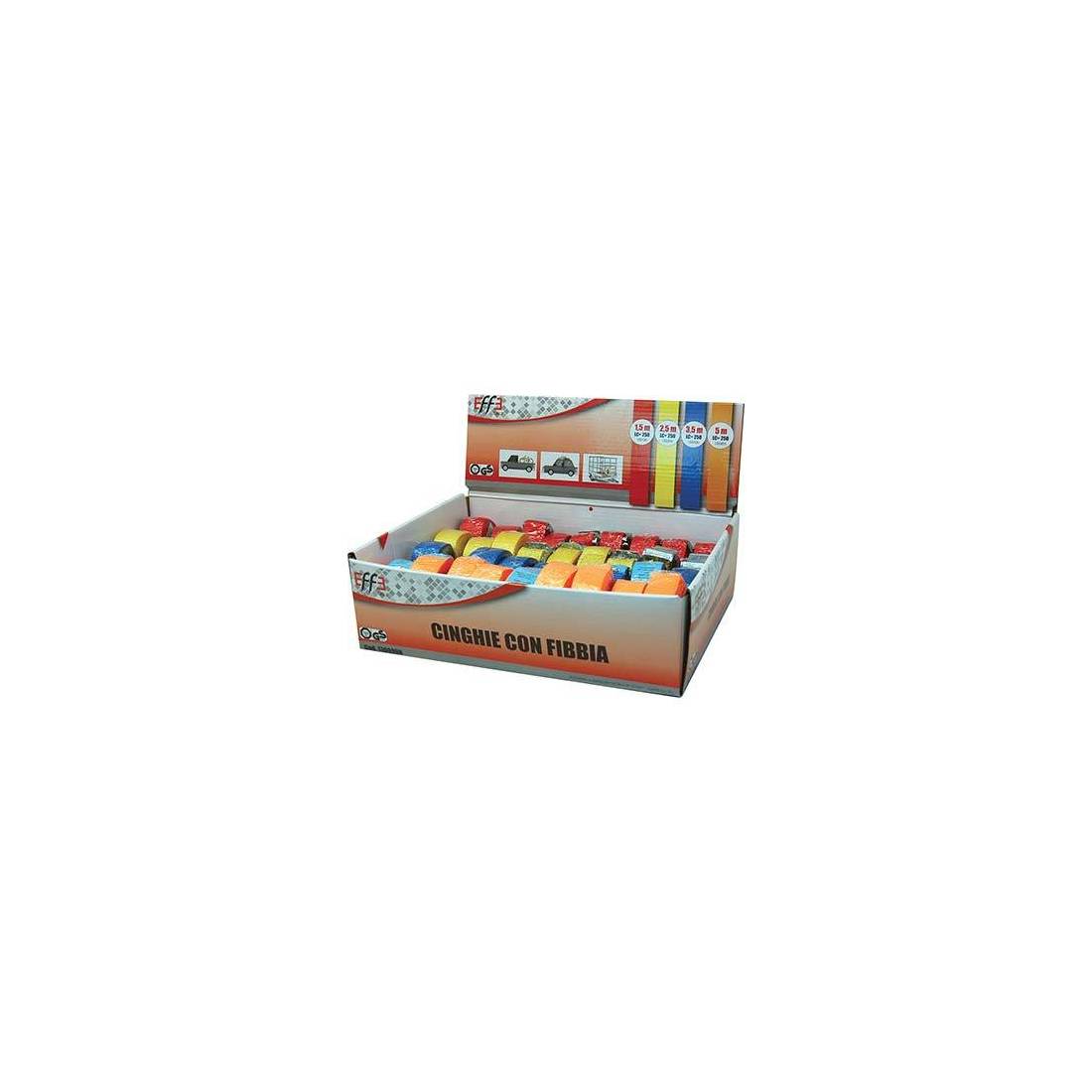 Système d'attache à anneau, avec boucle de serrage et sangle en polyester haute ténacité. Largeur 25 mm. Conforme à la norme EN 12195-2. Capacité : LC = 250 kg. Présentoir de 36 pièces assorties composé de : - 9 pièces : longueur 1,5 m. - 9 pièces : longueur 2,5 m. - 9 pièces : longueur 3,0 m. - 9 pièces : longueur 5,0 m.