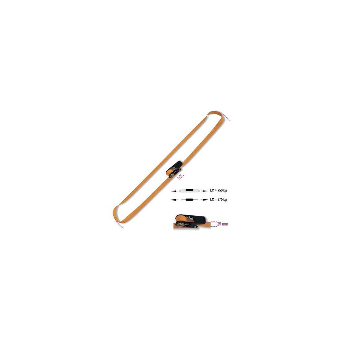 Système d'arrimage à anneau, avec cliquet tendeur et sangle en polyester haute ténacité de 25 mm de largeur. Longueur 5 m. Conforme à la norme EN 12195-2. Capacité de charge (anneau) : LC = 750 kg. Capacité de charge (traction) : LC = 375 kg.