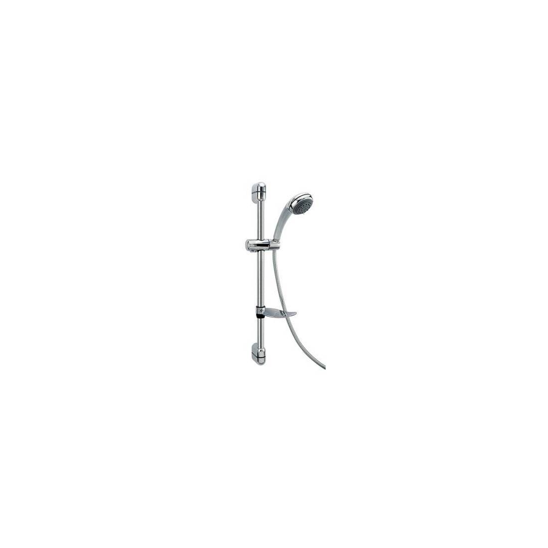 En ABS chromé. Flexible chromé de 150 cm de longueur. Avec tige ronde de 25 x 60 mm. Douche de 80 mm de diamètre. Avec porte-savon.
