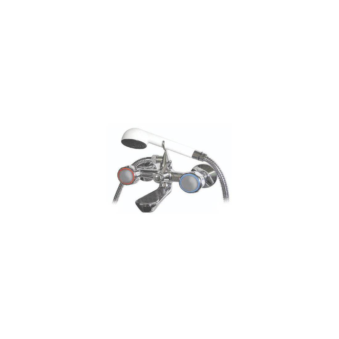 En laiton chromé. Avec double excentrique 1/2"x3/4". Avec flexible de douche de 150 cm et douchette à une fonction.