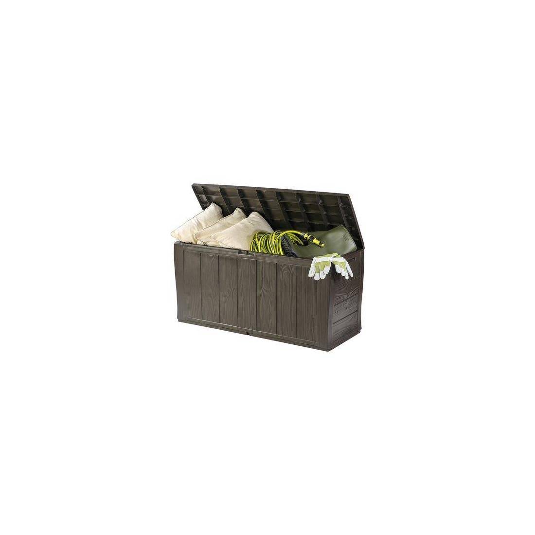 En résine, pour l'extérieur, avec décor bois, couleur marron. Avec roulettes et poignées pour le déplacement. Capacité jusqu'à 200 kg. Totalement imperméable.