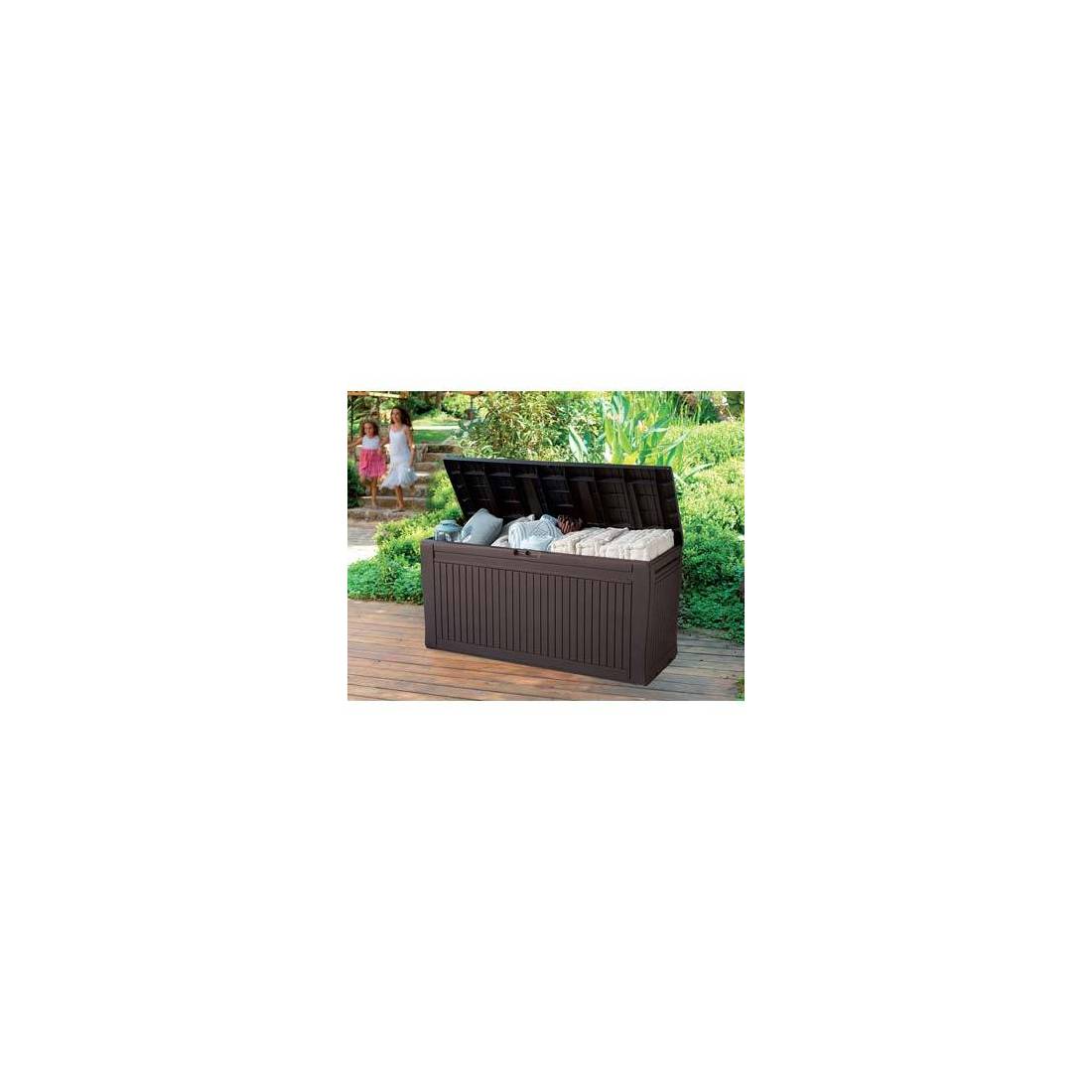 En résine pour extérieur, couleur marron. Avec roues et poignées pour le transport. Peut également être utilisée comme banc pour 2 personnes. Capacité maximale de 220 kg. Prédisposition pour cadenas. Totalement imperméable.