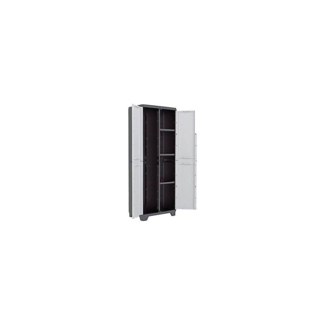 En plastique résistant de couleur grise avec finition bois. Avec deux portes, compartiment pour balais et 3 étagères réglables. Équipé de pieds réglables surélevés et prédisposé pour un cadenas. Capacité de charge par étagère : 10 kg. Résistant à la pluie.