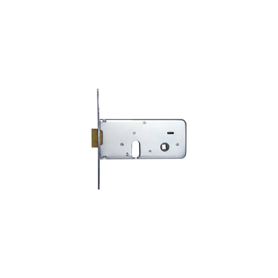 Pêne dormant avec verrou intégré. Fermeture à 2 tours de 10 mm. Carré de poignée 8 mm. Face avant en acier zingué avec bord carré de 16x160 mm. Boîtier hauteur 64 mm. Fourni avec : vis de fixation du cylindre et 3 clés plates.