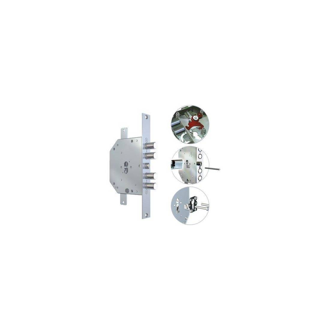 Pour cylindre profilé. Fixation du cylindre avec système Simply ou vis latérale. Équipée d'un bloc Clever. Pêne actionnable par clé ou poignée. Triple fermeture avec pêne à 4 pistons et 2 tours, course 29 mm, et prédisposition pour fermeture à tiges, course 14 mm. Cadre de poignée 8 mm, entraxe 72 mm. Face avant avec bord carré de 35x294 mm. Boîtier 130x164 mm. En acier zingué. Fourni avec : écussons et vis de montage.