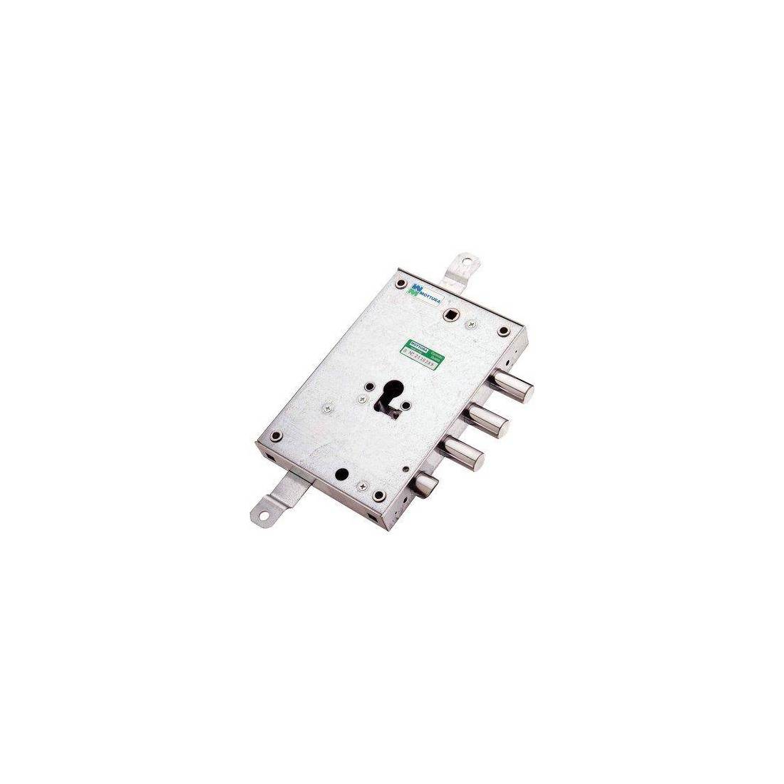 Pour cylindre profilé, raccord Mottura. Pêne actionnable par clé ou poignée. Triple fermeture avec pêne à pistons, saillie de 10 mm à serrure fermée, et 2 tours, course de 40 mm. Prédisposition pour fixation de tiges, course de 20 mm. Carré de poignée 8 mm, entraxe 85 mm. Boîtier 136x206 mm. En acier zingué.