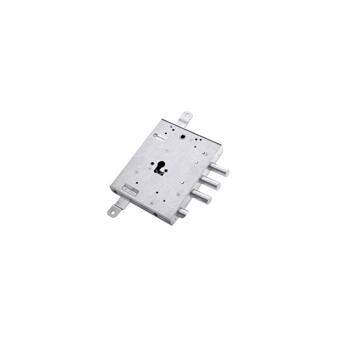 Pour cylindre profilé à fixation Mottura. Pêne actionnable par clé ou poignée. Triple fermeture avec pêne à 3 pistons et 2 tours, course 30 mm, et prédisposition pour fixation de tiges, course 20 mm. Carré de poignée 8 mm, entraxe 85 mm. Boîtier 162x206 mm. En acier zingué.