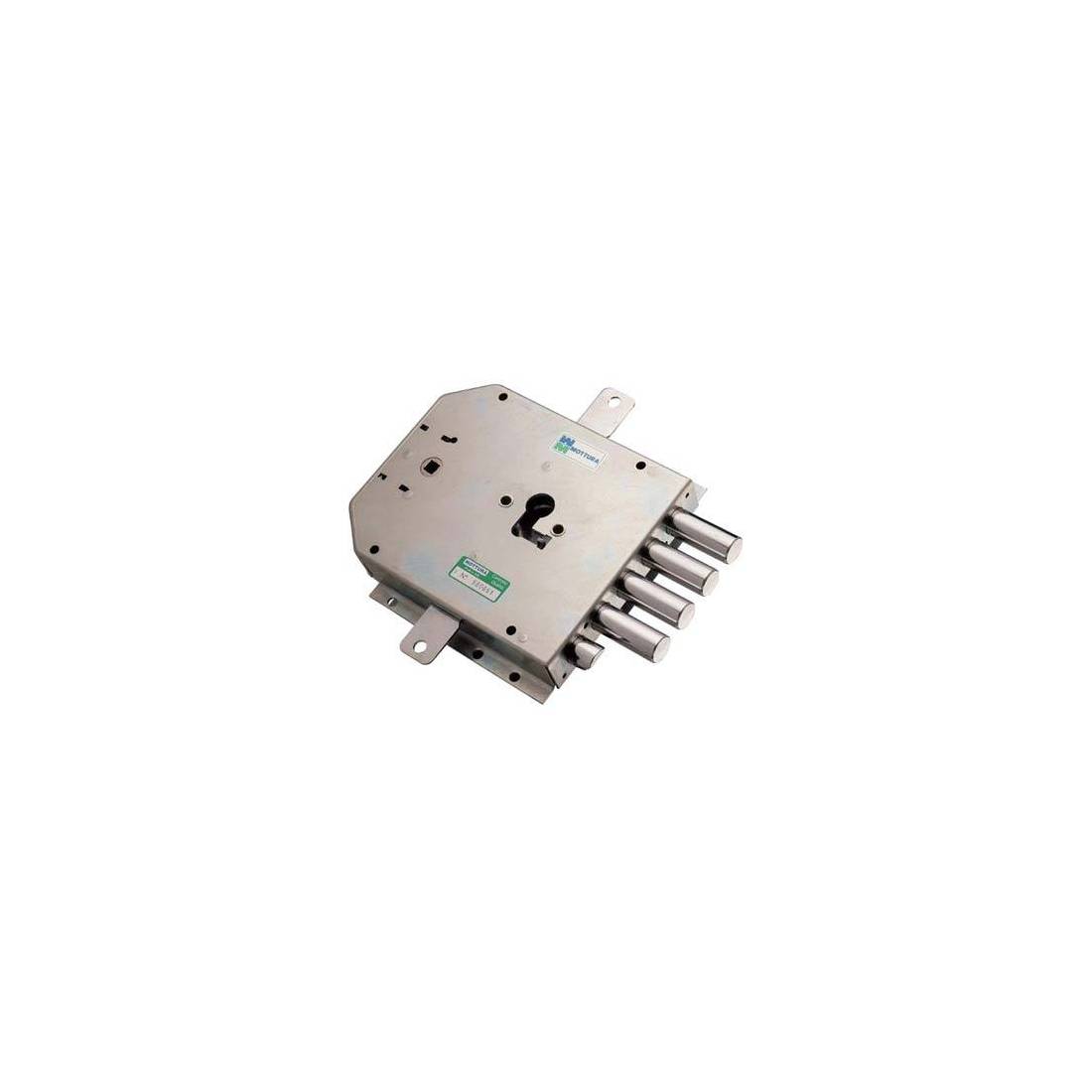 Pour cylindre profilé. Pêne actionnable par clé ou poignée. Triple fermeture avec pêne à 4 pistons et 2 tours, course 29 mm, et prédisposition pour fixation de tiges, course 17 mm. Carré de poignée 8 mm, entraxe 86,5 mm. Boîtier 182x159 mm. En acier zingué.