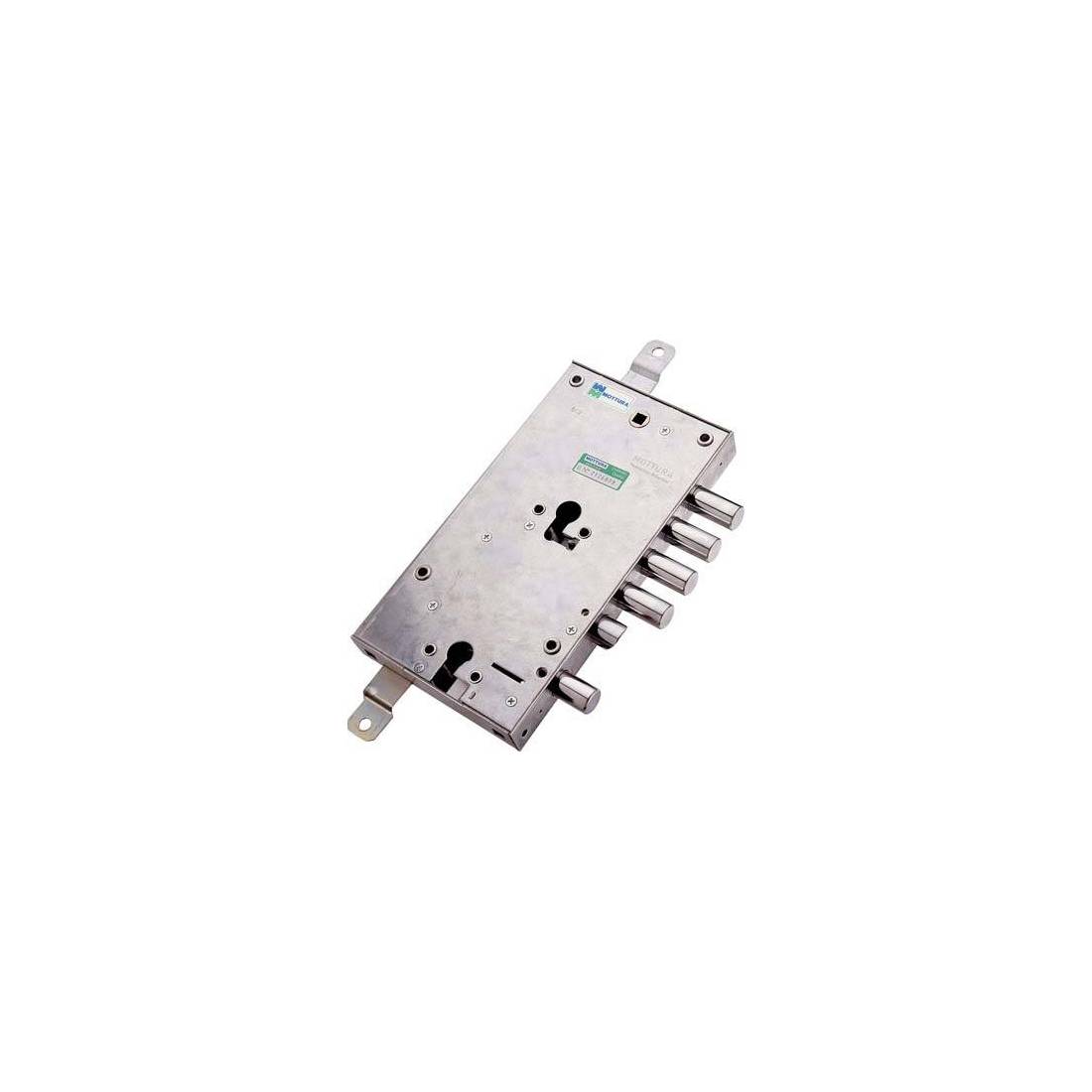 Pour double cylindre profilé, fixation Mottura, entraxe 120 mm. Pêne actionnable par clé supérieure ou poignée. La partie supérieure actionne la triple fermeture avec pêne à 4 pistons et 2 tours, course 29 mm, et prédisposition pour la fixation des tiges, course 20 mm. La partie inférieure actionne 1 pêne à 1 piston et 2 tours, course 22 mm, et bloque la serrure supérieure. Carré de poignée 8 mm, entraxe 85 mm. Boîtier 136x254 mm. En acier zingué.