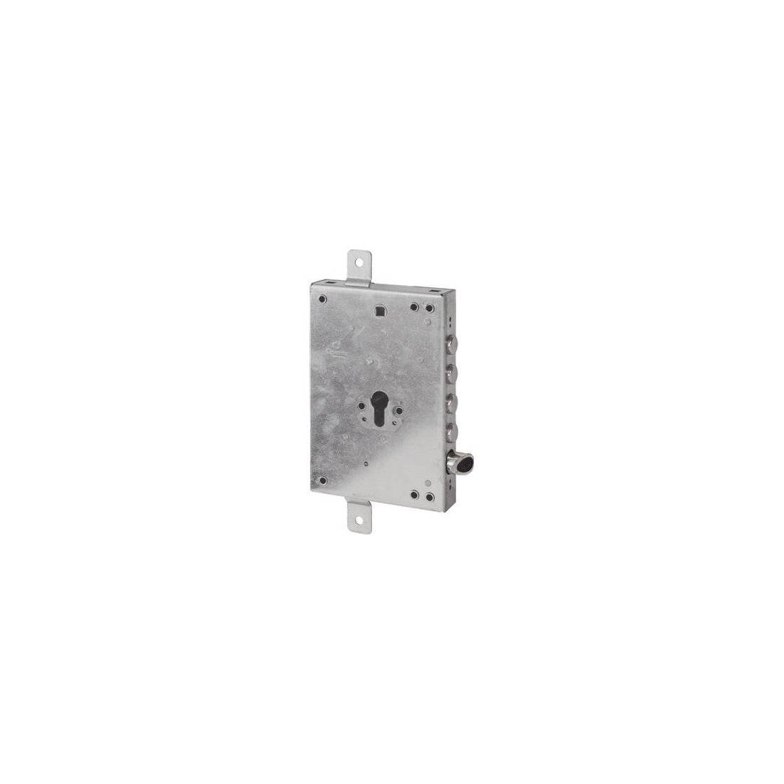 Pour cylindre profilé. Pêne réversible, réglable de 5 mm latéralement, actionnable par clé ou poignée. Triple fermeture avec pêne à 4 pistons et 2 tours, saillie de 3 mm et course de 29 mm, et prédisposition pour la fixation des tiges, course de 20 mm. Cadre de poignée 8 mm, entraxe 85 mm. Boîtier 136x206 mm. En acier zingué. Complet avec support et vis de fixation pour cylindre. Compatible 85571/28 Mottura.