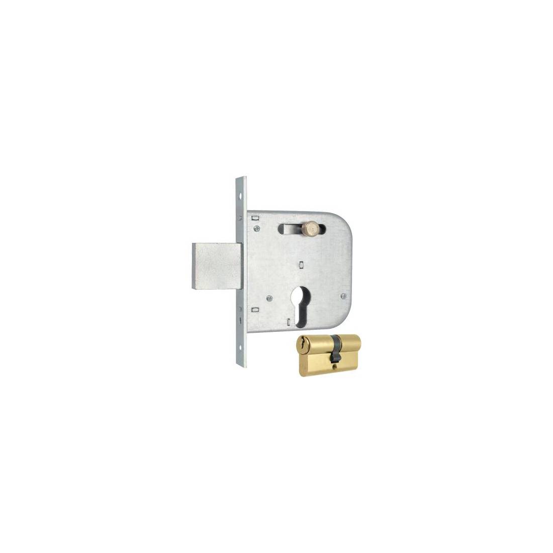 Avec cylindre profilé. À 2 tours et pêne avec bouton, pêne dormant en acier. Boîtier 95 x 96 mm. Face avant à bord carré en acier zingué 20 x 145 mm. Fourni avec : 3 clés plates.