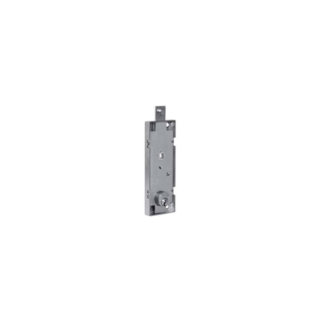 Avec cylindre rond fixe de 25 mm de diamètre. Vertical avec fermeture simple côté supérieur. Ouverture avec poignée de l'intérieur et de l'extérieur, déverrouillage de l'extérieur avec clé, de l'intérieur avec levier. Course du pêne dormant 24 mm. Carré de poignée 8 mm. Entraxe 67 mm. Boîtier en acier galvanisé 55,4 x 156 mm, épaisseur 15,5 mm. Fourni avec : 2 clés plates.