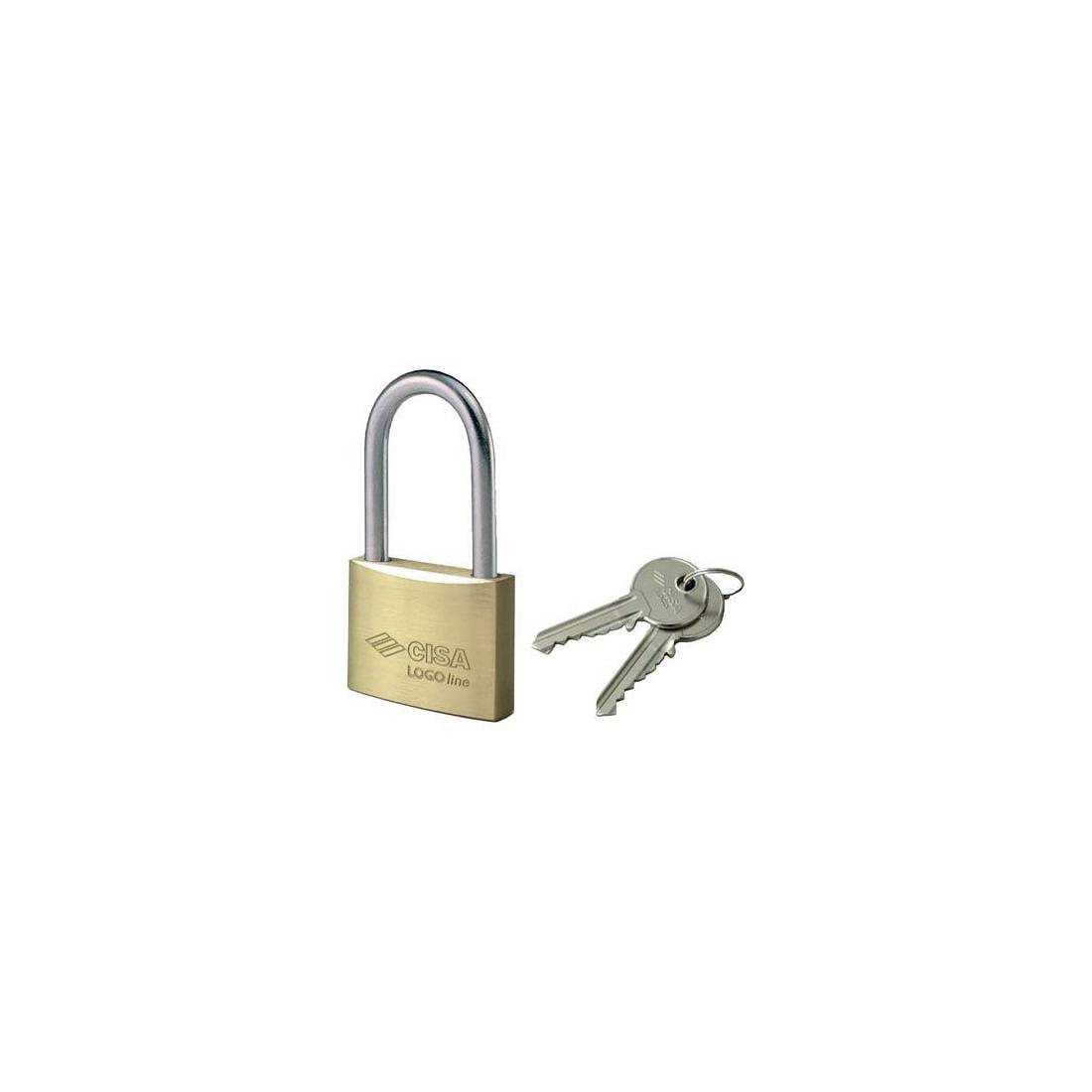 Corps monobloc en laiton satiné. Arc en acier carbonitruré nickelé. Double système de blocage de l'arc. Fourni avec 2 clés plates.