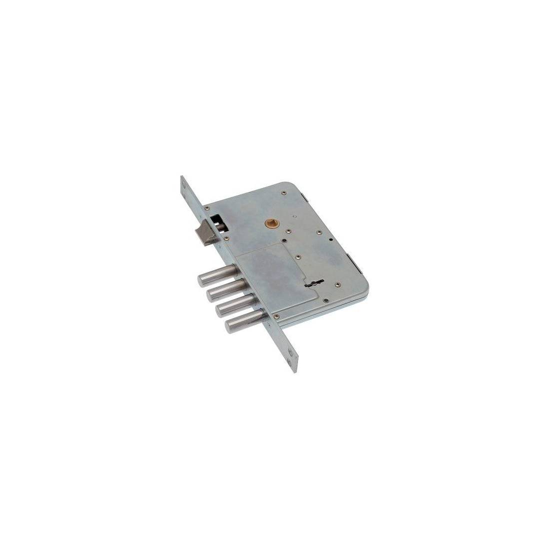Double panneton. Pêne réversible. Fermeture à 4 pênes à 4 tours. Carré de poignée 8 mm. Face avant en acier zingué avec bord carré de 25x265 mm. Hauteur du boîtier 174 mm. Fourni avec : 3 clés, 2 cache-serrure en laiton, 1 contre-plaque en acier galvanisé et vis de montage.