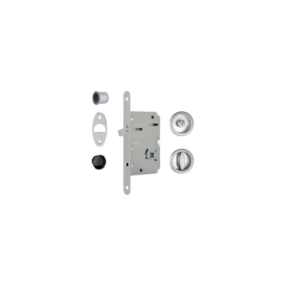 Pour portes coulissantes intérieures. Trou carré pour salle de bain. Ouverture d'urgence depuis l'extérieur avec loquet à encoche. Tous les éléments ont été conçus pour limiter l'encombrement à l'intérieur du panneau. Les rosaces sont fixées directement à l'aide d'un cadre à expansion, s'adaptant automatiquement à des épaisseurs de porte de 40 à 48 mm, sans utiliser de vis ou de sous-plaques en plastique.