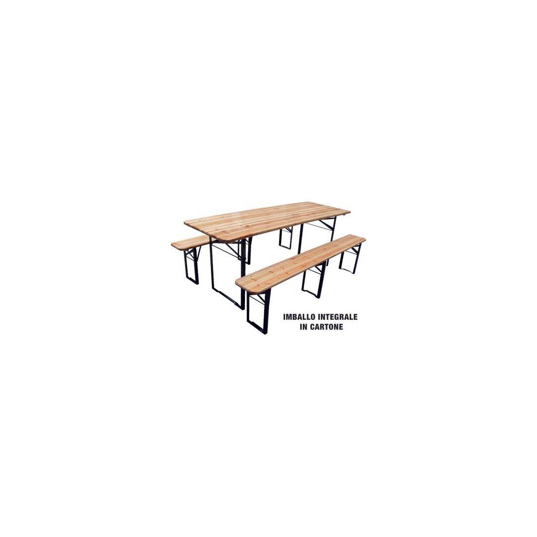 Ensemble composé d'une table et de deux bancs à 3 pieds pliables. Structure en acier peint et plateaux en bois traité. Emballage intégral en carton, spécialement conçu pour les expéditions par transporteur.