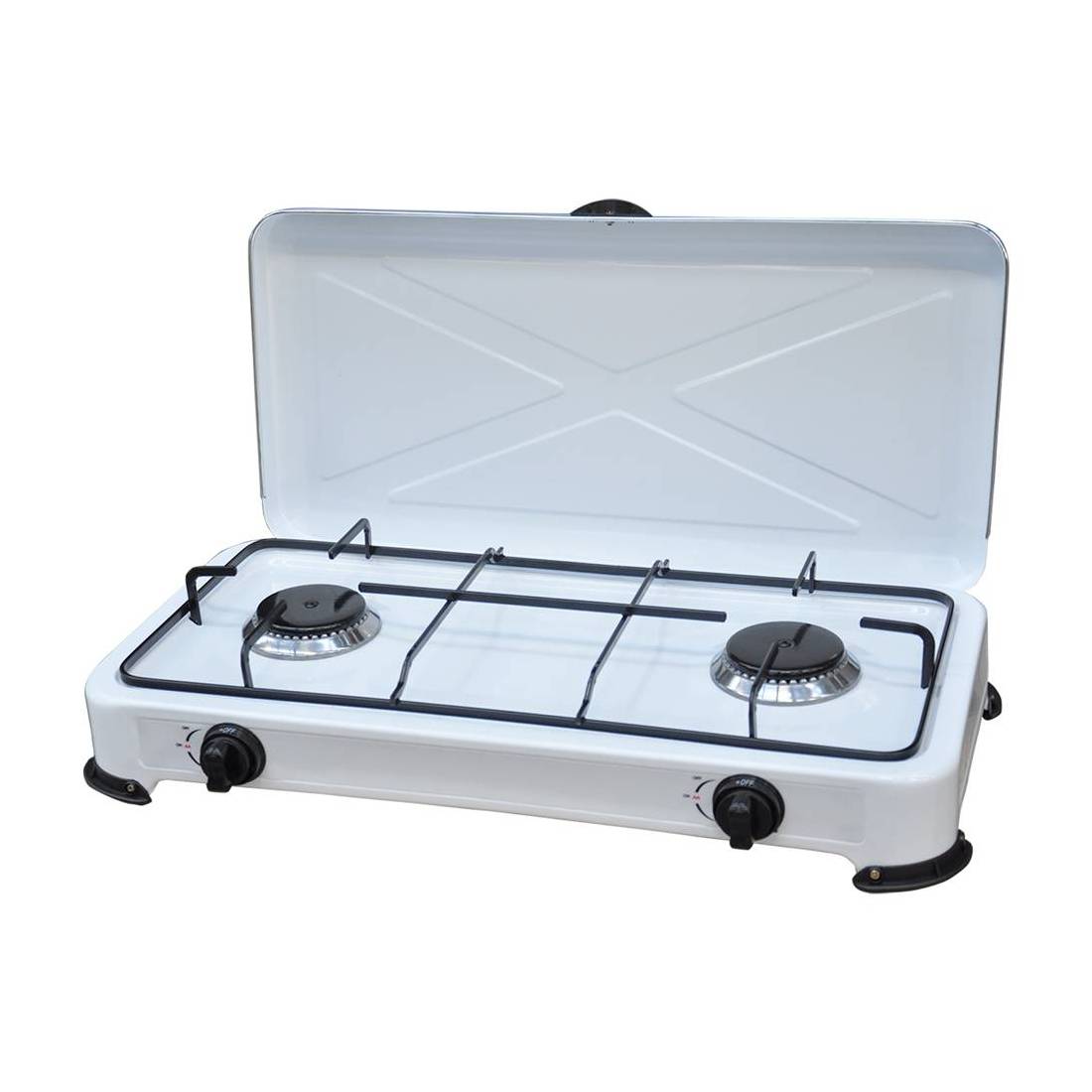 Piano cottura con due bruciatori in acciaio inox a potenza elevata. Struttura in acciaio smaltato. Adatto per uso casalingo, campeggi, pic nic e tempo libero. Con piedini antisdrucciolo. Potenza 2,2 kw.