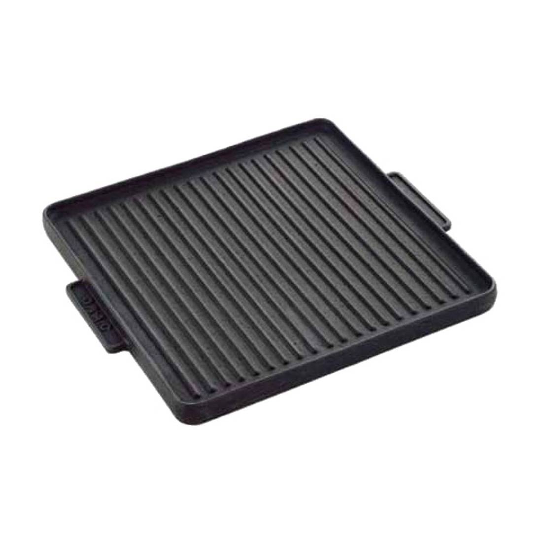 In ghisa, effetto pietra. Con maniglie laterali, senza telaio. Disponibili due superfici d'uso: lato liscio e lato rigato a seconda della cottura che si vuole realizzare. Utilizzabile anche su piano a induzione.